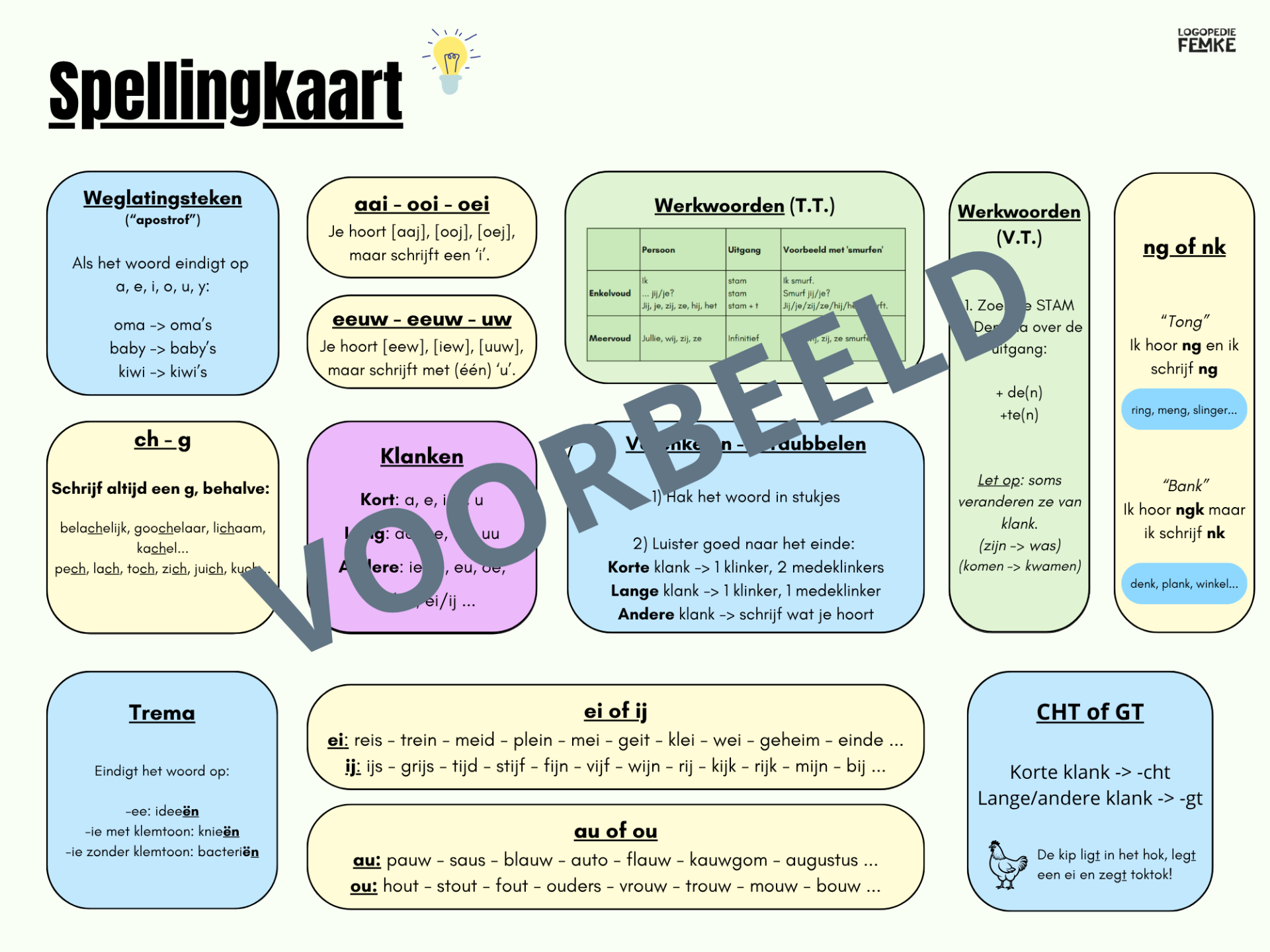 Een overzichtelijke spellingskaart met de meest voorkomende regelwoorden en onthoudwoorden waar kinderen uit het derde en vierde leerjaar vaak moeite mee hebben. Een praktisch hulpmiddel dat kinderen ondersteunt tijdens therapie, in de klas, bij taken of toetsen.